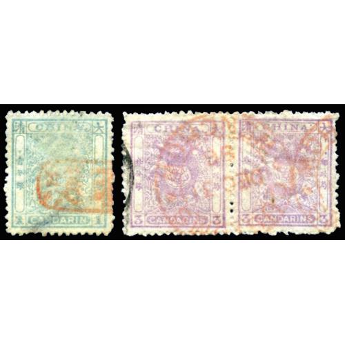 1885 海关一期小龙壹分银盖温州中文戳,叁分银双连盖温州海关DEC.31.96日戳,壹分银背有揭薄痕迹,少见.委托出价截标时间: