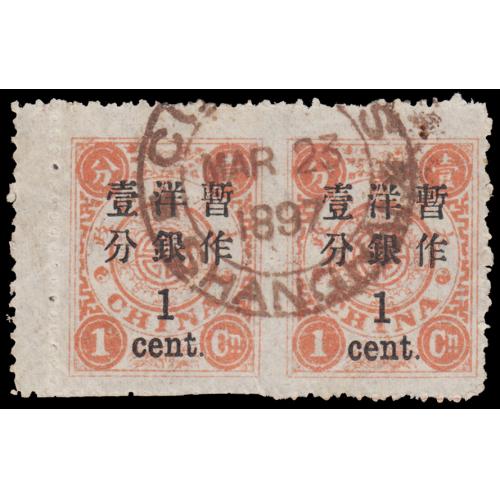 1897 慈禧寿辰再版加盖大字长距洋银壹分盖于壹分,横双连带左过桥边纸,双连票间漏齿,盖上海海关小圆戳,左边票底部有平齿。陈目57e, 稀罕之品.