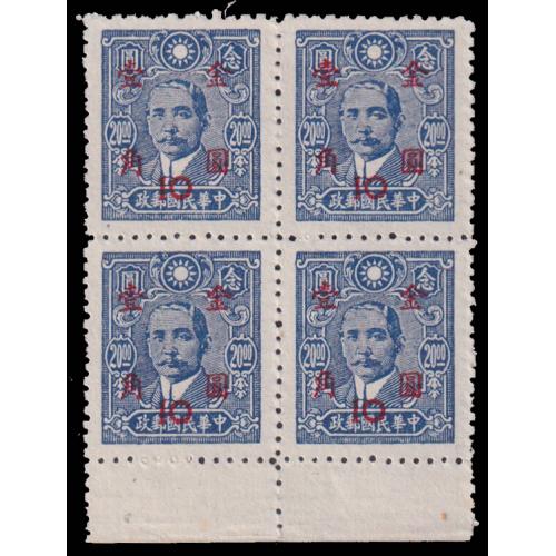 1948 金圆10分加盖于百城凸版20圆总理像12度齿四方连带下边纸, 陈目:G12b $120.