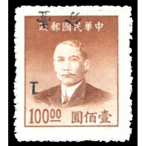 1949 总理像票$100广东加盖改值银圆1分, 倒盖.