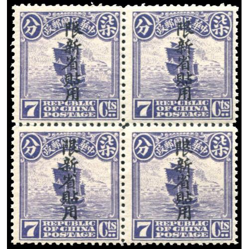 1924 北京一版7分帆船加盖"限新省贴用"四方连.