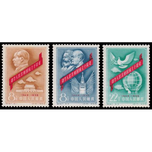 1959 纪67建国十周年第一组3枚全新原胶未贴无黄光润.