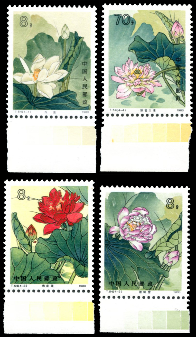 1980 T54荷花4枚全新带色标边纸.