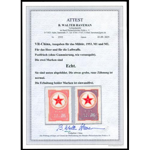 1953 黄军邮紫军邮各一枚新票未贴,附德国专家鉴定证书