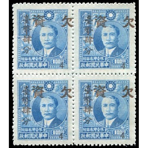 1950 4c/$100孙像加盖"欠资"四方连,背面有轻微黄斑.委托出价截标时间:
