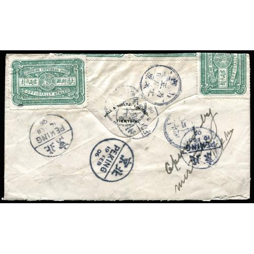 1906 年2月2日天津福利公司寄太原国内封, 贴2分蟠龙票, 于2月10日抵达太原, 并于2月19日寄回北京, 由W.XX先生打开并用4枚大清邮政第一次...