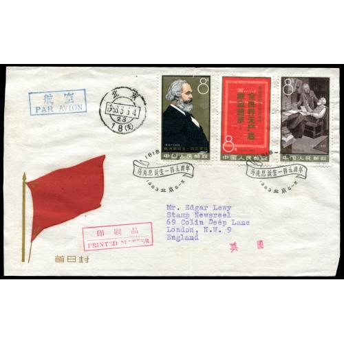 1963 纪98马克思诞生145周年3枚全总公司首日封航空印刷品北京寄英国.委托出价截标时间: