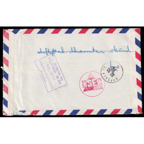 1974 普14/43分直双连北京总公司公文封航空挂号寄瑞典, 背盖乌普萨拉12.10.74到达戳, 手盖"退回寄件人",改寄新地址...