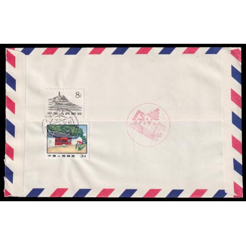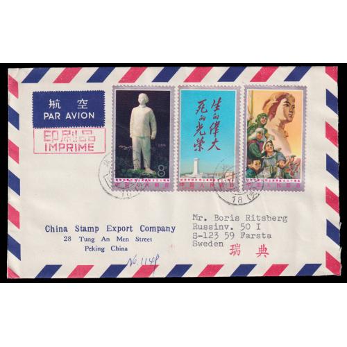1977 J12刘胡兰就义30周年3枚全北京总公司公文封首日航空寄瑞典,封背加贴R11/8分及R14/3分. 带原始函件.