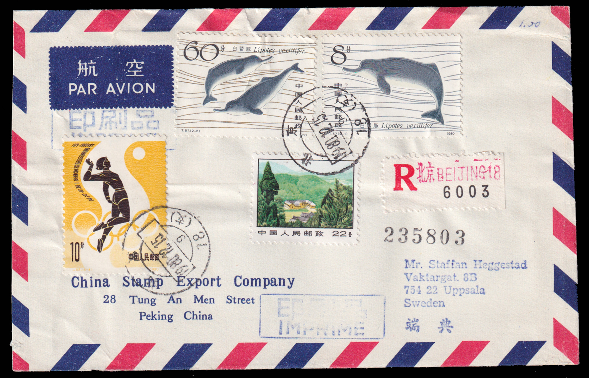 1980 白暨豚2枚全北京总公司公文封首日航空挂号寄瑞典, 加贴J62(5-4)及普14/22分.