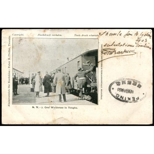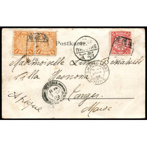 1903 年8月 格拉夫·瓦德西在塘沽明信片, 由河北顺德府寄摩洛哥, 贴蟠龙1分双连及2分销顺德府碑型戳, 经北京盖2?AUG1903椭圆戳, 上海及法国在华28AUG03中转, 经香港盖VICTORIA 1.SEP戳.少见寄非洲盖碑型戳片.委托出价截标时间: