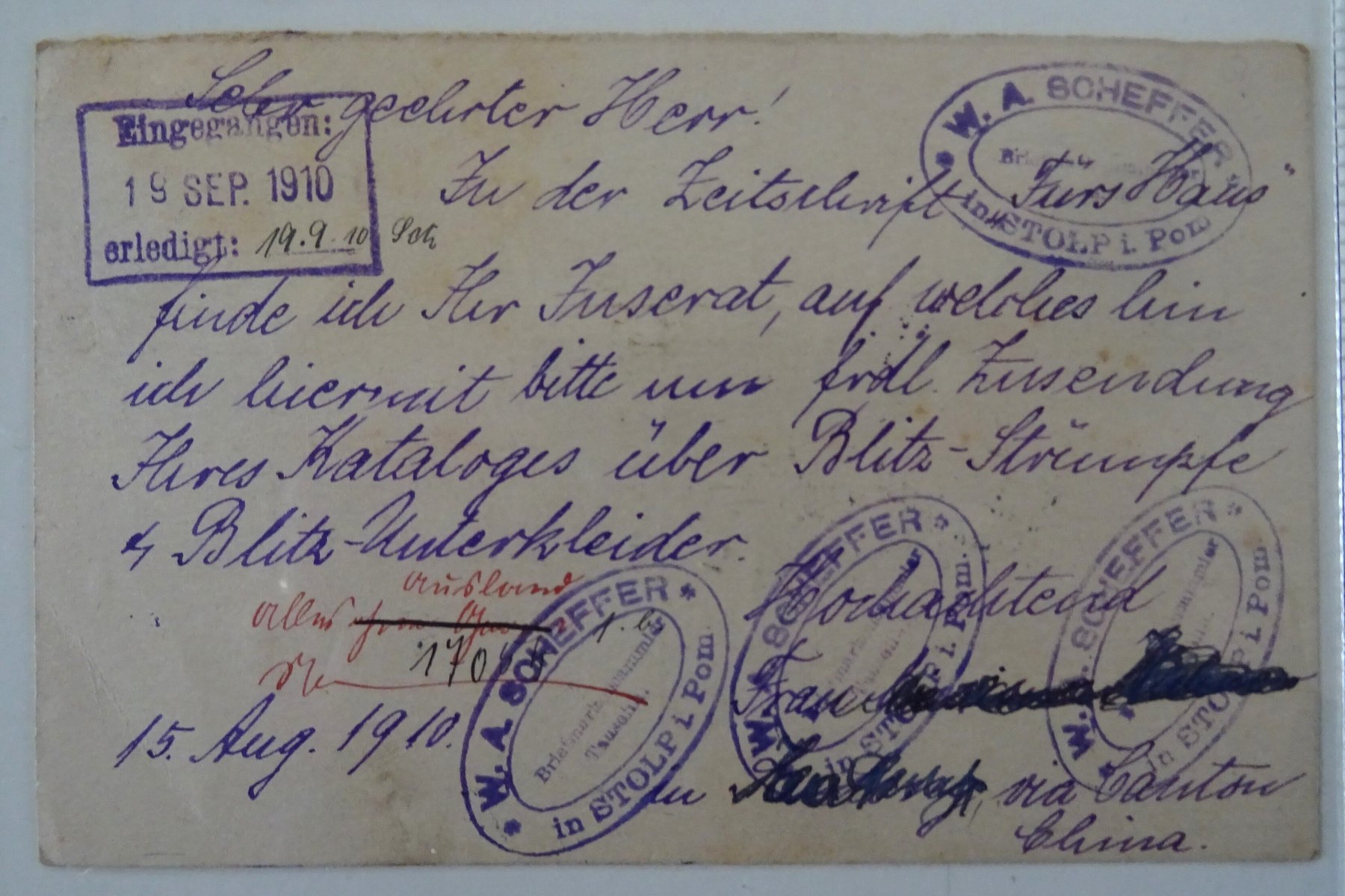 1910 8月18日清4次邮资片双片之回片广东新塘寄德国, 旁盖广州19日中转戳, 经法国驻广东客邮局运转欧洲, 背盖德国9月19日到达戳. 此片原始应该...