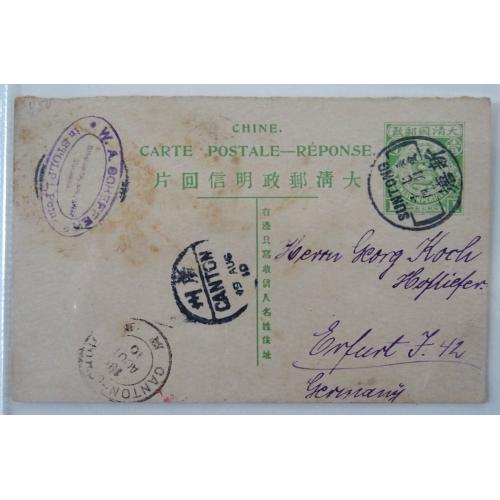 1910 8月18日清4次邮资片双片之回片广东新塘寄德国, 旁盖广州19日中转戳, 经法国驻广东客邮局运转欧洲, 背盖德国9月19日到达戳. 此片原始应该是完整双片寄德国于同一收件人, 故不需再贴附加邮资.委托出价截标时间: