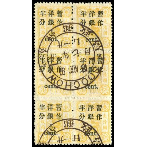 1897 Surch. small figure ½c on 1st print Dowager Jubilee 3ca block of 6 with SOOCHOW 18 AUG 97 Large Dollar cds. One stamps with "½"over "n" of cent variety,Chan:37f. Scarce Soochow large dollar dater.The deadline for pre-auction bidding for lot no. 1-558:10:00 CET on March 7. 2026, the online live/floor auction will start at 10:30 CET.