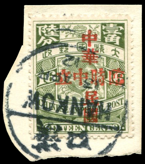 1912 "ROC Provisional Neutrality" overprint on 16c used on piece with Hankow 13 APR 1912 cds. Only 200 issued.