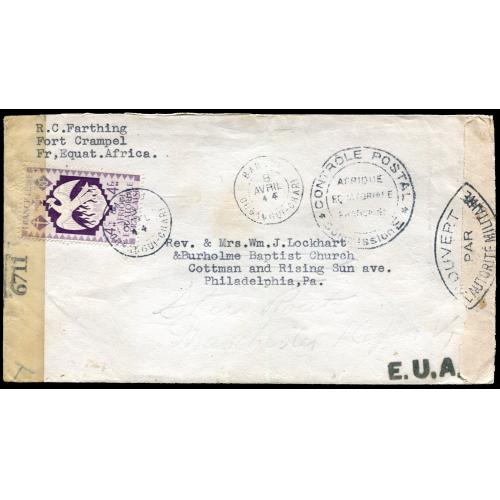 FRANCH Africa Equatoriel 1944 cover franked with 4f to USA, with two franch and one US censorchops.