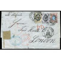 RUSSIA 1872 Letter sent from St. Petersburg to London, franked with 1k,5k and 10k Arm types Russian...