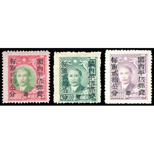 1949 西川国内平信单位票加盖于孙像贰萬圆、肆拾萬圆及伍拾萬圆,印备而未发行,陈目2100美元.