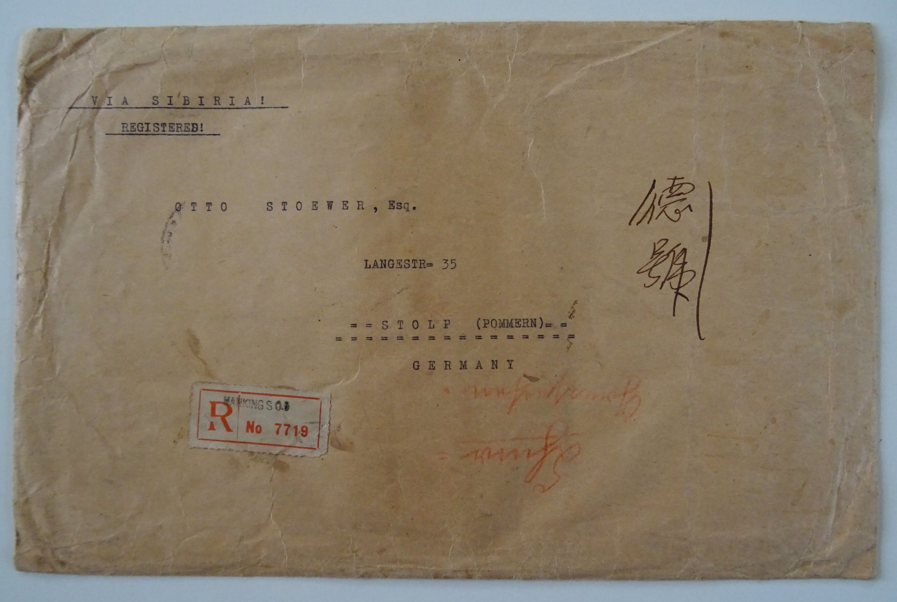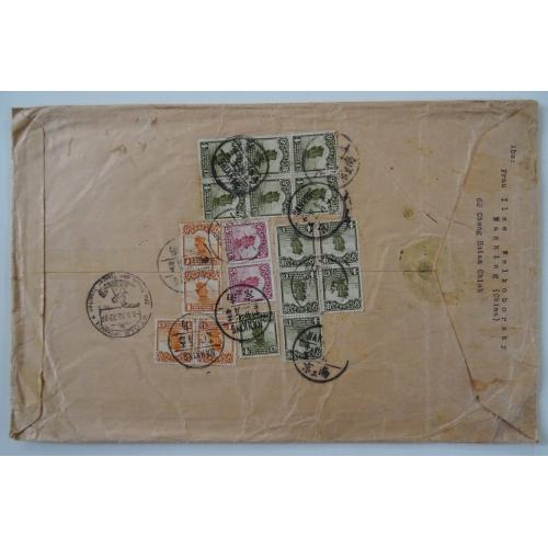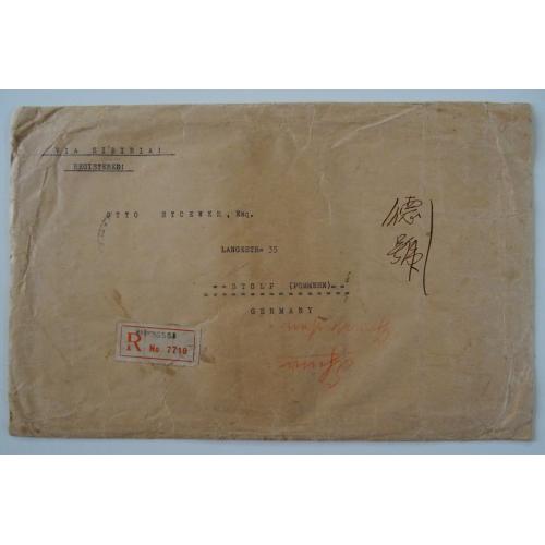 1930 7月21日南京经西伯利亚寄德国挂号封,背贴北京二版帆船票1分4枚,4分13枚及5分2枚,其中一枚4分票丢失,盖德国斯托普8月3日到达戳.