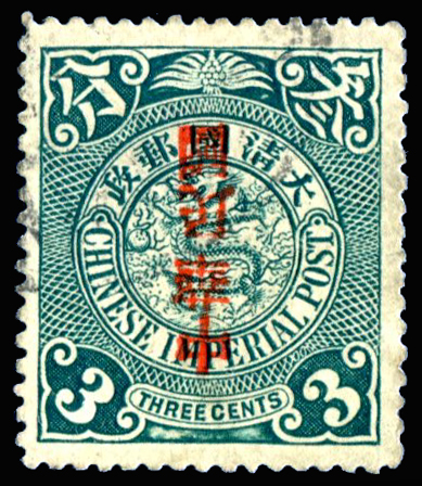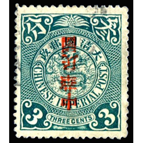 1912 Republic overprint on 3c blue-green Coiling Dragon with overprint inverted variety.