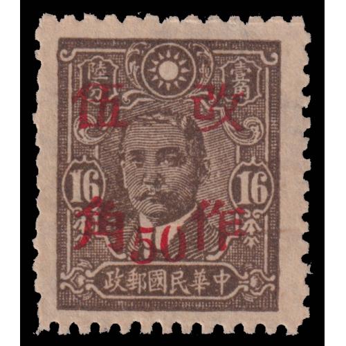 1943 General Office surch. 50c on 16c SYS p12. Chan:642k $200. With broken "0" variety.