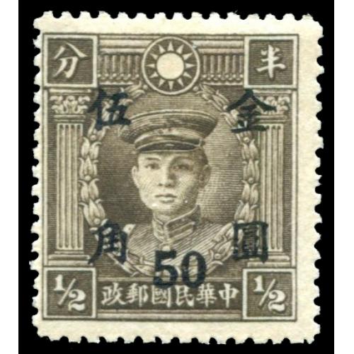 1948 Gold Yuan surch. 50c on Peking print ½c Martyr.The deadline for pre-auction bidding for lot no. 1-558:10:00 CET on March 7. 2026, the online live/floor auction will start at 10:30 CET.