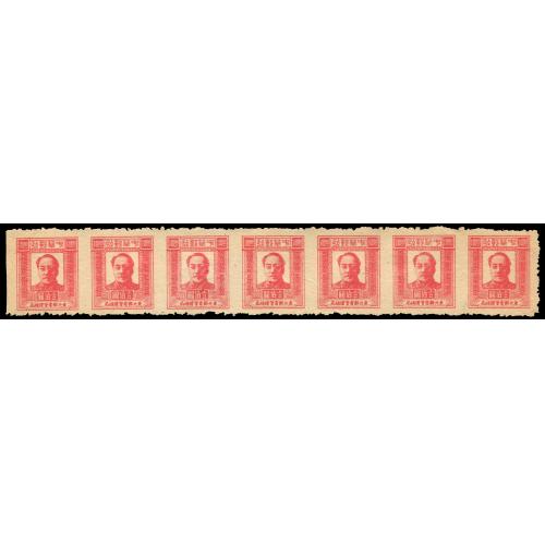 1947 North-East China 2nd print Mao $100 strip of 7 with imperforation between stamps varieties.