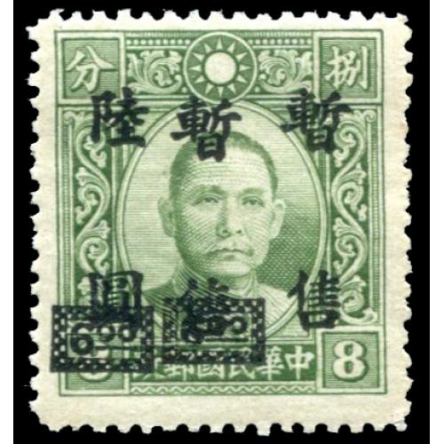 1943 Nanking and Shanghai surch. $6 on 8c SYS with surch. double variety. Chan:JC50a $165.The deadline for pre-auction bidding for lot no. 1-558:10:00 CET on March 7. 2026, the online live/floor auction will start at 10:30 CET.