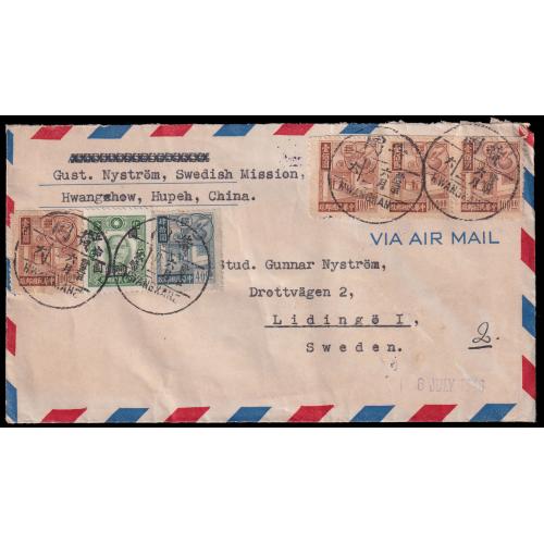 1946 Jun. 22 Airmail cover sent from Hwangchow to Sweden, franked with Postal Saving design $40, $100 strip of 3 and a single, SYS $50/5c stamps...