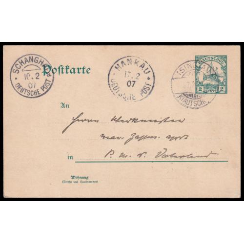 1901 German P.O. -1907 Two German Post Office in China pre-stamped cards, sent from Kiaochow, 5p sent to Germany and 2c via Shanghai to Hankow, p...