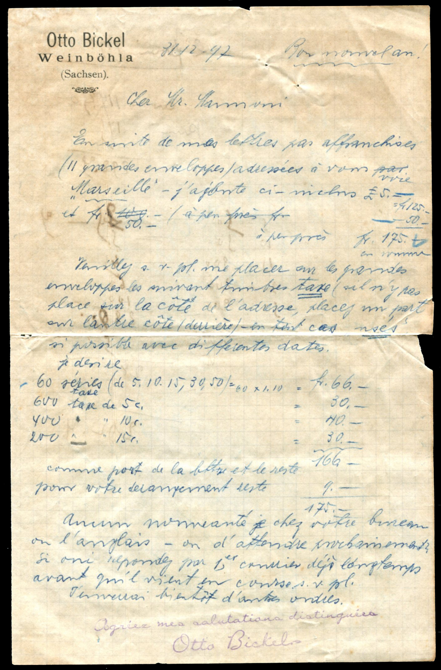 ZANZIBAR 1898 Two registration receipts with ZANZIBAR post marking, additional a handwritten letter from Otto Bickel ordering stamps from Zanzibar Post Office. Unusual.The deadline for pre-auction bidding for lot no. 1-558:10:00 CET on March 7. 2026, the online live/floor auction will start at 10:30 CET.