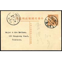 1934 7th print 1c pre-stamped Junk card used Tientsin locally.